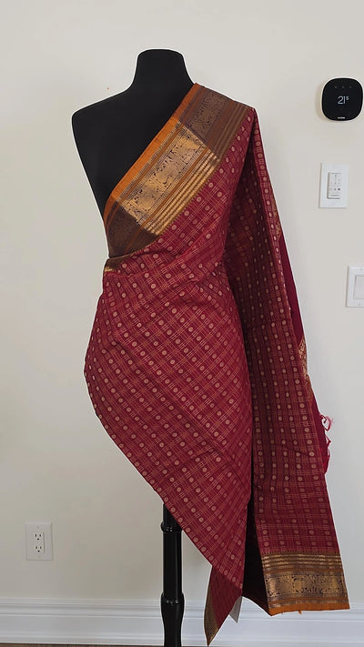 Indulge in luxury with our Maroon Premium Cotton Saree. Made from the finest cotton, this saree exudes elegance and sophistication. Complete with running blouse material, this saree is a must-have for any fashion-forward woman. Elevate your style and make a statement with this premium saree.