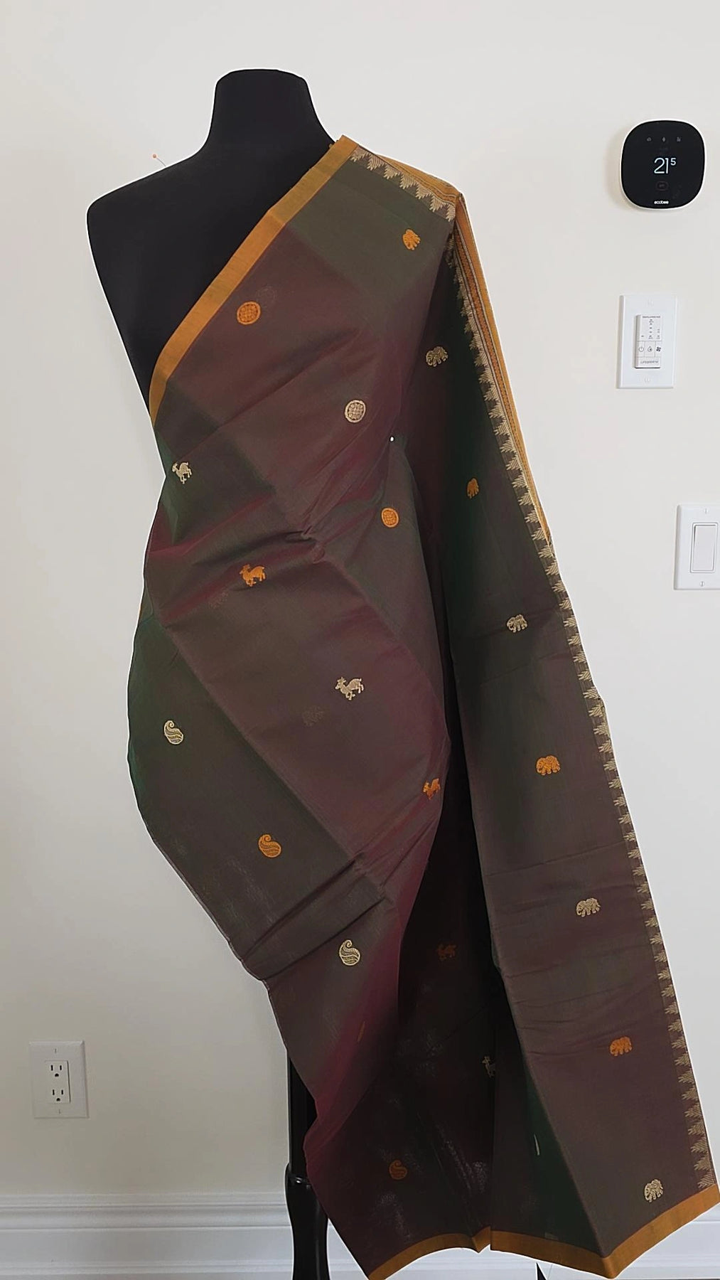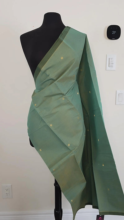 Indulge in the luxurious elegance of our Peacock Green Pure Handloom Silk Cotton Saree. The soft silk cotton fabric is delicately handwoven to create a stunning peacock green hue, reflecting the regal beauty of this magnificent creature. Accompanied by a running blouse material, this saree is a timeless addition to your wardrobe.