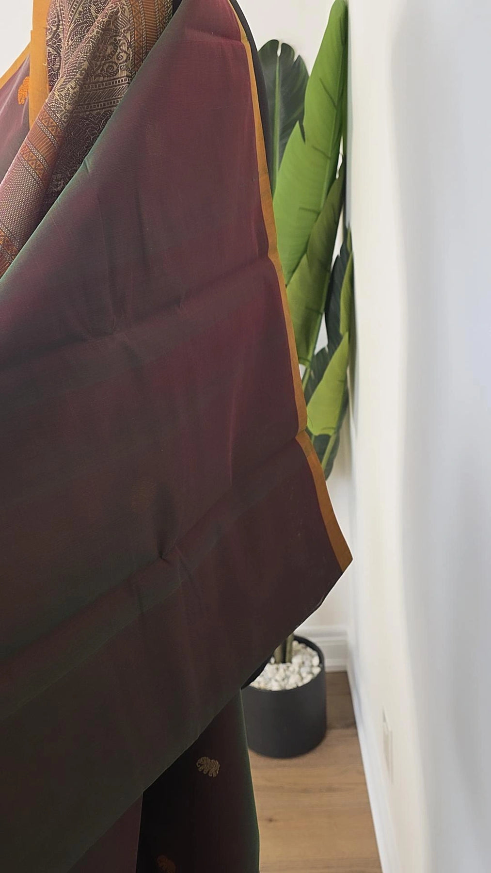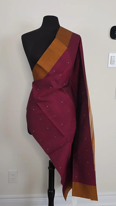 This Purple Kutty Border Pure Handloom Silk Cotton is meticulously handwoven and showcases a stunning contrast border in deep shades of purple. Made with a blend of premium silk and cotton, this fabric offers a luxurious feel and a comfortable fit. Includes matching blouse material for a complete, elegant look.