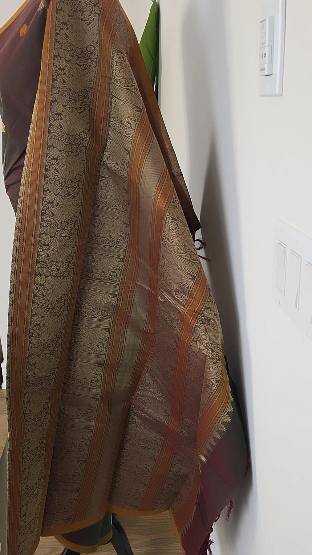 Elevate your style with our purple Check Kalashejtra Kili Kanjipuram Saree. The expert craftsmanship and refined look make it perfect for any occasion. Made with premium materials, this versatile piece offers both comfort and sophistication. Complete with a plain saree blouse and bordered sleeves, it exudes elegance.