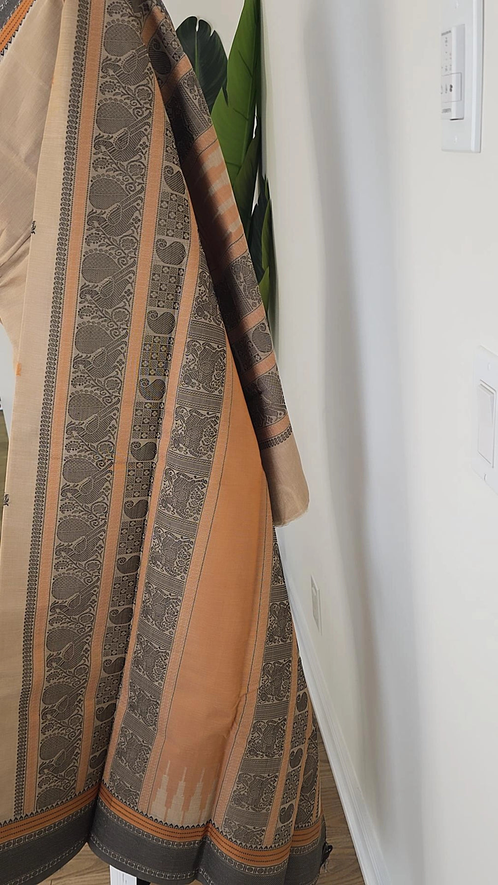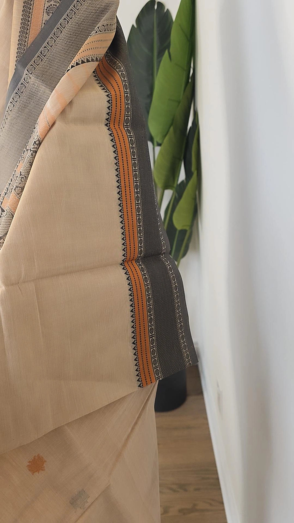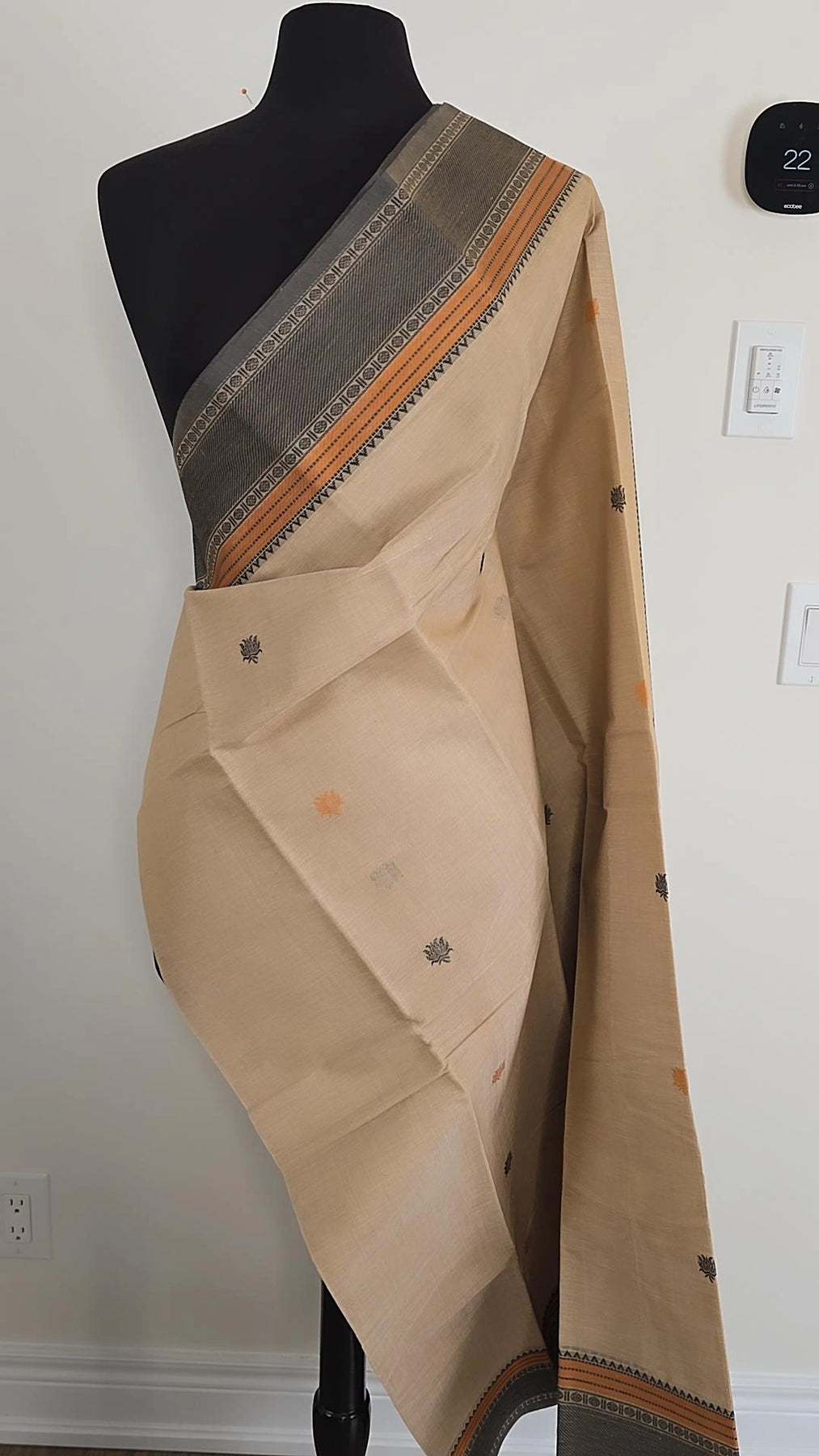 This premium cotton biscuit coloured saree features a thread Banaras border with lotus butta design. Crafted with high-quality materials, it offers both comfort and style. Elevate your wardrobe with this elegant saree, perfect for any occasion.